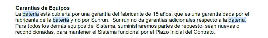 La batería es el componente con mayor tasa de desgaste y el costo de reemplazo más alto del sistema. Sin embargo, mientras el contrato permanece activo por 15 años, la garantía real del manufacturero solo cubre los primeros 10. Eso deja un periodo de cinco años completamente expuesto, sin respaldo y sin responsabilidad contractual para Sunrun.